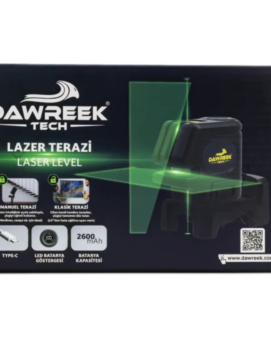 Dawreek şarküllü nokta lazer, hassas ölçüm ve hizalama için özel kutusunda sunulan profesyonel bir alettir.
